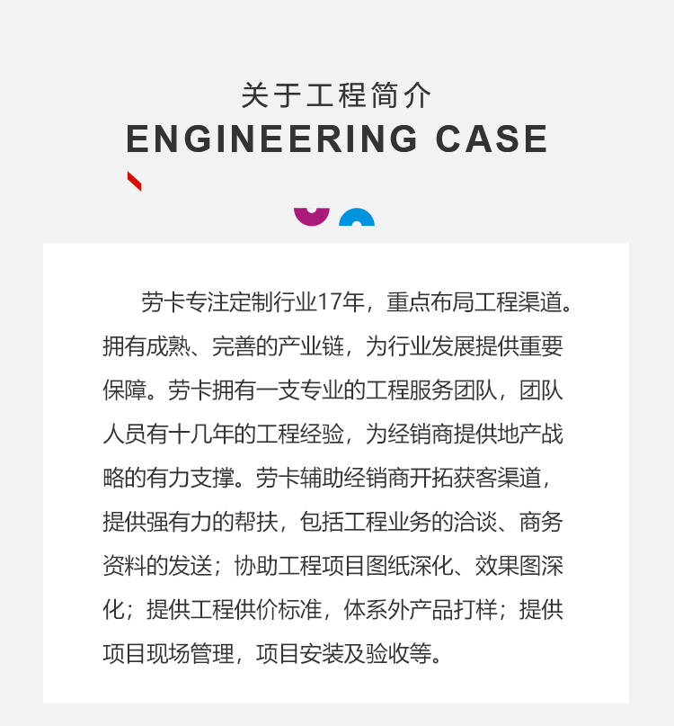 团队人员有十几年的工程经验,为经销商提供地产战略的有力支撑。凯发天生赢家一触即发辅助经销商开拓获客渠道,提供强有力的帮扶,包括工程业务的洽谈,